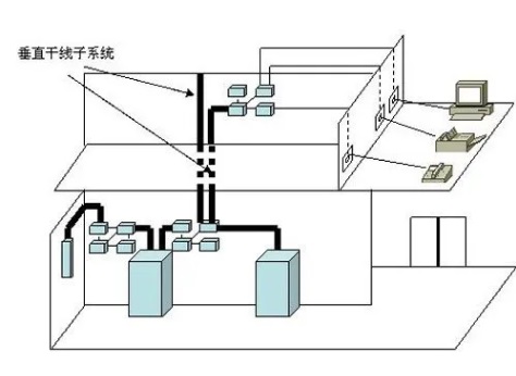 4、垂直干線子系統(tǒng) 垂直干線子系統(tǒng)又稱干線子系統(tǒng),垂直干線子系應(yīng)由設(shè)備間的配線設(shè)備和跳線以及設(shè)備間至各樓層配線間的連接電纜組成。垂直子系統(tǒng)的主要功能是通過建筑物內(nèi)部的傳輸電纜或光纜,把各接線間和二級(jí)交接間的信號(hào)傳送到設(shè)備間,直至傳送到最終接口,再通往外部網(wǎng)絡(luò)。簡單說就是用來連接設(shè)備間和管理區(qū)子系統(tǒng)之間的線纜,是整個(gè)布線系統(tǒng)的主干。