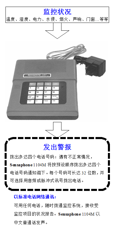 1、通過(guò)電話網(wǎng)絡(luò)進(jìn)行多功能環(huán)境/自動(dòng)化工程監(jiān)控 1).Sensaphone 1104M多功能監(jiān)控系統(tǒng)操作方便,程序設(shè)定簡(jiǎn)單容易。 2、即使不在場(chǎng),您也可以確保設(shè)備安全穩(wěn)妥,自動(dòng)化工程運(yùn)作正常 3、問題發(fā)生,實(shí)時(shí)通知您 遇有不正常的狀況,Sensaphone 1104M系統(tǒng)實(shí)時(shí)撥出多達(dá)四個(gè)電話號(hào)碼,以英語(yǔ)/普通話通知您,您亦可遙距監(jiān)聽現(xiàn)場(chǎng)聲音