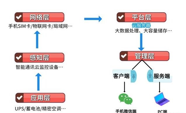 我們多次提到動(dòng)環(huán)監(jiān)控方案是由溫濕度模塊、電力監(jiān)控模塊、漏水檢測(cè)模塊、安防監(jiān)控模塊、網(wǎng)絡(luò)監(jiān)控模塊等組成的綜合性監(jiān)控系統(tǒng)。那么這次我們來(lái)聊聊動(dòng)環(huán)監(jiān)控方案的基本結(jié)構(gòu)。 從基本結(jié)構(gòu)上來(lái)講,動(dòng)環(huán)監(jiān)控方案可以由三部分組成,分別是:信息感知層(前端監(jiān)控)、網(wǎng)絡(luò)通信傳輸層(無(wú)線傳輸部分)、應(yīng)用服務(wù)層(后臺(tái)管理中心)三部分成。 一、信息感知層(前端監(jiān)控) 信息感知層(前端監(jiān)控)主要由物聯(lián)網(wǎng)設(shè)備組成,因此它又稱為物聯(lián)網(wǎng)設(shè)備端。根據(jù)應(yīng)用場(chǎng)景的不同,感知層搭載的設(shè)備是多種多樣的,包括溫濕度監(jiān)控模塊、漏水監(jiān)控模塊、ups監(jiān)控模塊、發(fā)電機(jī)監(jiān)控模塊、空調(diào)監(jiān)控模塊、門(mén)禁監(jiān)控模塊、防盜監(jiān)控模塊、消防監(jiān)控模塊等。主要復(fù)雜前端信息的采集,最主要的性能就是數(shù)據(jù)采集,采集的信息包括環(huán)境信息、性能信息、異常信息和業(yè)務(wù)信息。 二、網(wǎng)絡(luò)通信傳輸層(無(wú)線傳輸部分) 網(wǎng)絡(luò)通信傳輸層(無(wú)線傳輸部分)是整個(gè)網(wǎng)絡(luò)體系結(jié)構(gòu)中的關(guān)鍵層次之一,主要負(fù)責(zé)向兩個(gè)主機(jī)中進(jìn)程之間的通信提供服務(wù)。信息感知層(前端監(jiān)控)將溫濕度監(jiān)控模塊、漏水監(jiān)控模塊、ups監(jiān)控模塊、發(fā)電機(jī)監(jiān)控模塊、空調(diào)監(jiān)控模塊、門(mén)禁監(jiān)控模塊、防盜監(jiān)控模塊、消防監(jiān)控模塊等采集到的信息傳輸?shù)骄W(wǎng)絡(luò)通信傳輸層,而網(wǎng)絡(luò)通信傳輸層作為橋梁將信息傳輸?shù)胶笈_(tái)管理中心,并對(duì)這些信息進(jìn)行集中監(jiān)控與管理。 三、應(yīng)用服務(wù)層(后臺(tái)管理中心) 應(yīng)用服務(wù)層(后臺(tái)管理中心)的主要作用是接收、處理網(wǎng)絡(luò)通信傳輸層傳來(lái)的各項(xiàng)數(shù)據(jù),同時(shí)通過(guò)后臺(tái)大屏、手機(jī)端、PC端對(duì)數(shù)據(jù)進(jìn)行觀察、判斷,并對(duì)出現(xiàn)的異常進(jìn)行報(bào)警。 動(dòng)環(huán)監(jiān)控解決方案依靠這三大部分完成系統(tǒng)的采集、分析、傳輸、監(jiān)控和管理,完成機(jī)房、圖書(shū)館、博物館等的24小時(shí)無(wú)人值守下安全、穩(wěn)定、持續(xù)運(yùn)行。