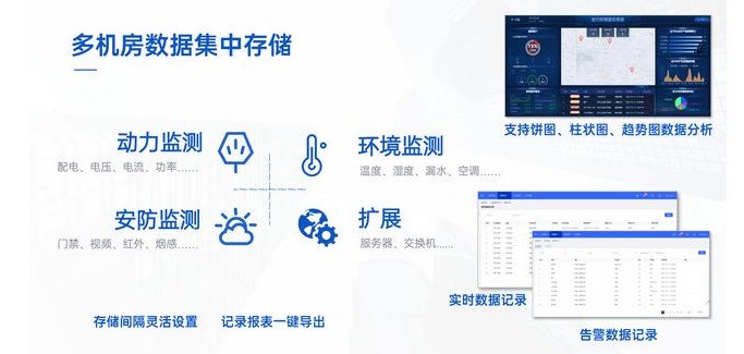 三、動(dòng)環(huán)監(jiān)控的性能特點(diǎn) (1)統(tǒng)一管理:對(duì)機(jī)房?jī)?nèi)的各種設(shè)備運(yùn)行數(shù)據(jù),機(jī)房整體狀況,進(jìn)行實(shí)時(shí)監(jiān)測(cè),同時(shí)在設(shè)備智能運(yùn)維管理平臺(tái)上進(jìn)行統(tǒng)一管理,自動(dòng)記錄和保存設(shè)備和運(yùn)維日志。 (2)遠(yuǎn)程管理:通過監(jiān)測(cè)到的數(shù)據(jù),對(duì)應(yīng)的遠(yuǎn)程控制設(shè)備的開關(guān),狀態(tài)調(diào)整。 (3)可擴(kuò)展性:機(jī)房動(dòng)環(huán)監(jiān)控系統(tǒng)的設(shè)備智能運(yùn)維管理系統(tǒng)采用云存儲(chǔ),存儲(chǔ)容量高,可擴(kuò)展性強(qiáng)。 (4)機(jī)房?jī)?nèi)所有的信息,提供數(shù)據(jù)分析,數(shù)據(jù)查詢等功能。 (5)運(yùn)行維護(hù)效率高:選擇大數(shù)據(jù)算法,智能化協(xié)助運(yùn)行維護(hù)可在幾秒鐘內(nèi)完成,錯(cuò)誤率較低,協(xié)助運(yùn)行維護(hù)人員高效檢查,提供運(yùn)行維護(hù)效率。