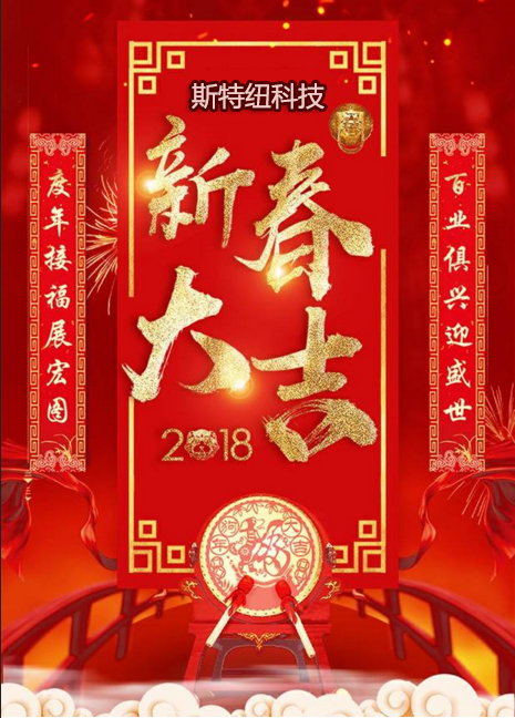 隨著2018年春節(jié)臨近,年味越來越重了,時時響起的鞭炮聲,和人來人往的集市都能感受到,春節(jié)就要來了。我們跟隨國家假日規(guī)定從2月12日-2月23日放假,24號正式上班,給大家?guī)聿槐阏堈徑猓?/p> 我們不懈努力,并根據(jù)多年來與客戶不斷深入溝通,銷售團隊與技術支持團隊不斷在實踐一線實地勘察,斯特紐已積累了十分豐富的行業(yè)經(jīng)驗。從售前溝通到方案制定,從按時發(fā)貨到實地安裝,從技術指導到售后回訪,斯特紐一步一個腳印,用高品質(zhì)的產(chǎn)品、扎實的服務,贏得客戶的信任與好評。 在未來,斯特紐將以飽滿的熱情、澎湃的激情,奮力前進、奔向未來。繼續(xù)用產(chǎn)品實力、技術實力、服務實力回饋廣大客戶朋友,回饋社會。 在此新春佳節(jié)來臨之際,斯特紐全體員工恭祝大家闔家歡樂,新春大吉!