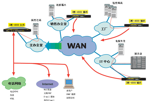 Sensaphone IMS-4000是智能一體化監(jiān)控主機(jī)是一款多功能遠(yuǎn)程監(jiān)控報(bào)警主機(jī),集UPS監(jiān)控,配電監(jiān)控、空調(diào)監(jiān)控,視頻監(jiān)控,門(mén)禁監(jiān)控、溫濕度監(jiān)控、瓦斯檢測(cè)、電氣火災(zāi)檢測(cè)、防盜監(jiān)控于一體,產(chǎn)品穩(wěn)定,功能強(qiáng)大。該設(shè)備特點(diǎn)是安裝便捷,使用簡(jiǎn)單,容易維護(hù),是機(jī)房建設(shè)與維護(hù)領(lǐng)域中成熟可靠的動(dòng)力環(huán)境監(jiān)控產(chǎn)品。 該公司通過(guò)該系統(tǒng)實(shí)現(xiàn)對(duì)機(jī)房溫度、濕度、煙霧、噪音、漏水、門(mén)禁、安全、電源及空調(diào)、UPS故障報(bào)警等。同時(shí),還可監(jiān)控網(wǎng)絡(luò)上的IP設(shè)備,定時(shí)檢查IP設(shè)備的狀態(tài),包括路由器、服務(wù)器、打印機(jī)等帶有IP地址網(wǎng)絡(luò)設(shè)備。 該系統(tǒng)為該公司各分公司機(jī)房提供該公司7*24小時(shí)的不間斷、無(wú)人值守與遠(yuǎn)程監(jiān)控服務(wù),通過(guò)對(duì)潛在危險(xiǎn)的監(jiān)控,以保證機(jī)房正常運(yùn)作,防止服務(wù)中斷,減少客戶(hù)投訴等。 在以前,這些站點(diǎn)是通過(guò)人力監(jiān)控的,時(shí)間都消耗在往返各個(gè)站點(diǎn)的路上,而且實(shí)際上絕大多數(shù)的機(jī)房仍處于無(wú)監(jiān)控狀態(tài)。該系統(tǒng)除減少了人工成本外,也減少了機(jī)器的停工時(shí)間,消除對(duì)貴重設(shè)備的損壞,及時(shí)地解決了潛在的災(zāi)難。 目前,該公司在國(guó)內(nèi)設(shè)立的所有分公司都安裝了該系統(tǒng),例如:深圳、廣州、北京、上海、青島、福州、杭州、成都等地,在深圳安裝該系統(tǒng)主機(jī),監(jiān)測(cè)8個(gè)環(huán)境參數(shù)及64個(gè)IP地址,因?yàn)槊颗_(tái)主機(jī)最多可支持31臺(tái)該系統(tǒng)副機(jī),所以成都等地只需要安裝副機(jī),同樣監(jiān)測(cè)8個(gè)環(huán)境參數(shù)及64個(gè)IP地址,主機(jī)與副機(jī)之前通過(guò)廣域網(wǎng)聯(lián)結(jié),所占數(shù)據(jù)流量很小,任何授權(quán)人員都可隨時(shí)隨地管理。 我司的機(jī)房環(huán)境監(jiān)控系統(tǒng),實(shí)現(xiàn)了機(jī)房設(shè)備的統(tǒng)一監(jiān)控,減輕了機(jī)房維護(hù)人員負(fù)擔(dān),提高了系統(tǒng)的可靠性,實(shí)現(xiàn)了機(jī)房的科學(xué)管理。